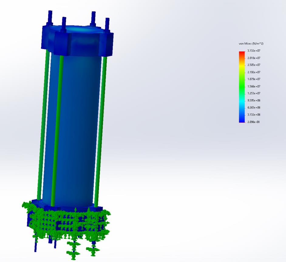 Finite element analysis used to evaluate stress in the vessel and help guide the design before fabrication.